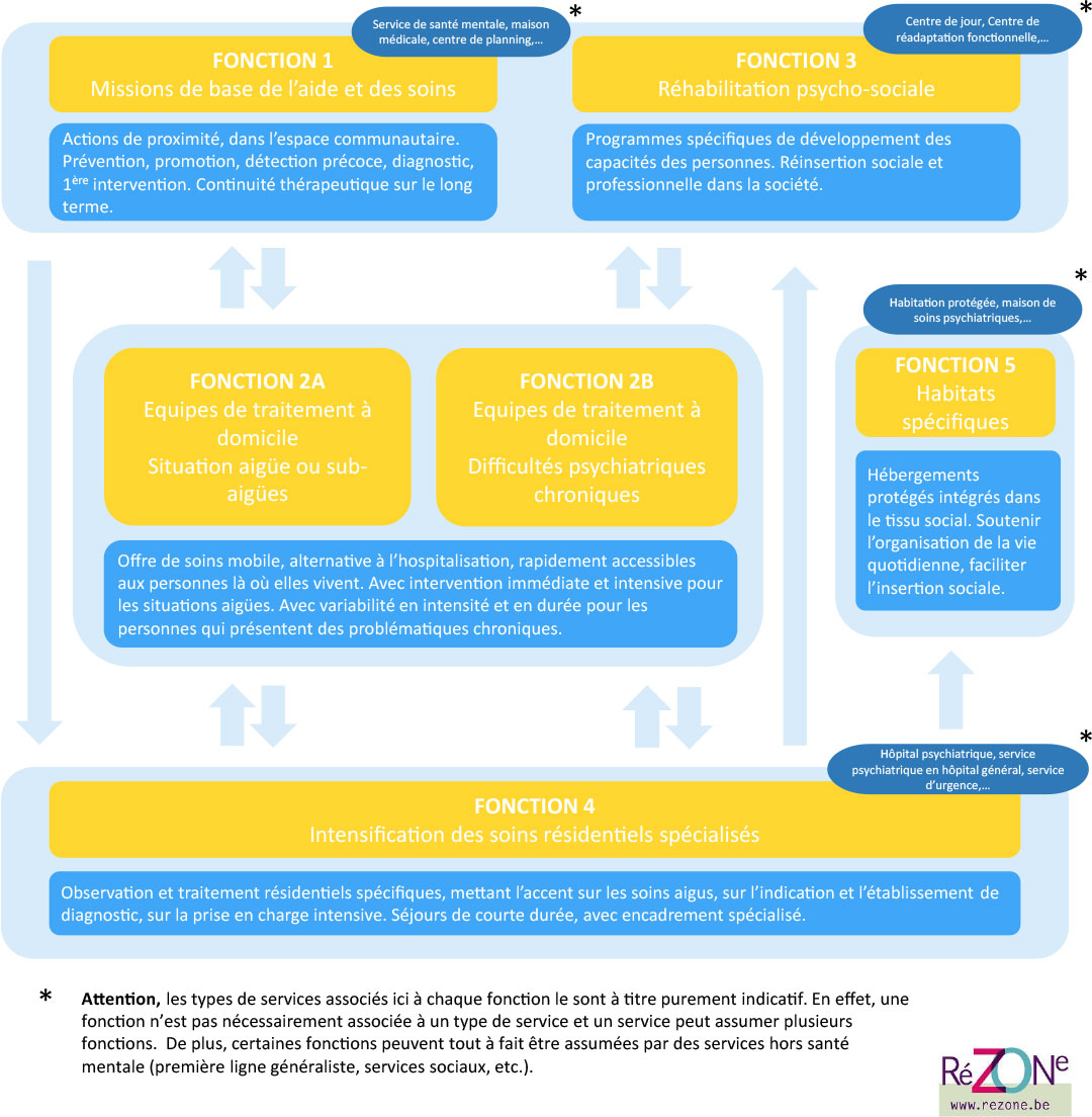 L'objectif de cette réforme, outre la création d'équipes mobiles (fonction 2a et 2b), est de faire en sorte que les services organisent collectivement selon 5 fonctions de soins de manière cohérente et coordonnée, sur un territoire de référence.